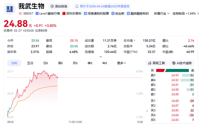 3月27日,创新药概念持续走高,我武生物盘中快速拉升,涨幅一度接近5%。截至发稿,报24.88元/股,涨幅3.80%,换手率2.31%,成交额2.76亿元。