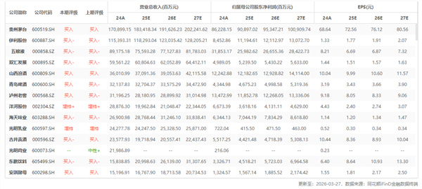 行业重点公司最新盈利预测综合值