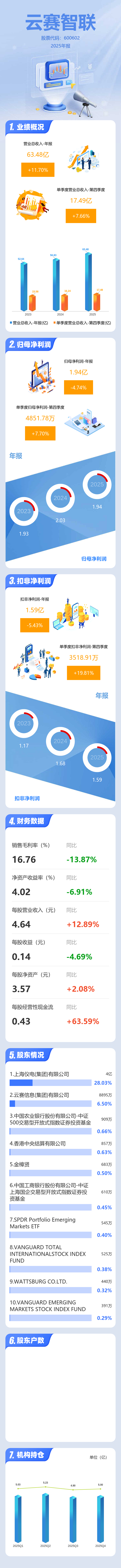 证券之星消息,云赛智联2025年年报显示,当年度公司主营收入63.48亿元,同比上升11.71%;归母净利润1.94亿元,同比下降4.74%;扣非净利润1.59亿元,同比下降5.44%;其中2025年第四季度,公司单季度主营收入17.49亿元,同比上升7.66%;单季度归母净利润4851.78万元,同比上升7.71%;单季度扣非净利润3518.91万元,同比上升19.82%;负债率44.29%,投资收益2023.75万元,财务费用-6640.83万元,毛利率16.76%。