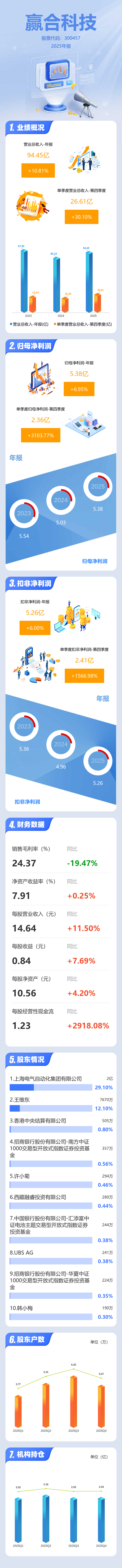 证券之星消息,赢合科技2025年年报显示,当年度公司主营收入94.45亿元,同比上升10.81%;归母净利润5.38亿元,同比上升6.96%;扣非净利润5.26亿元,同比上升6.01%;其中2025年第四季度,公司单季度主营收入26.61亿元,同比上升30.1%;单季度归母净利润2.36亿元,同比上升3103.78%;单季度扣非净利润2.41亿元,同比上升1566.98%;负债率63.59%,投资收益-384.16万元,财务费用-3175.03万元,毛利率24.37%。