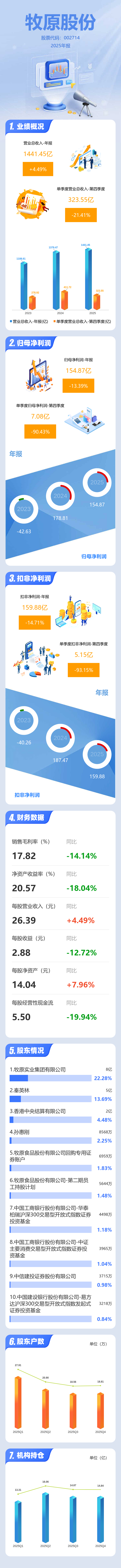 证券之星消息,牧原股份2025年年报显示,当年度公司主营收入1441.45亿元,同比上升4.49%;归母净利润154.87亿元,同比下降13.39%;扣非净利润159.88亿元,同比下降14.71%;其中2025年第四季度,公司单季度主营收入323.55亿元,同比下降21.41%;单季度归母净利润7.08亿元,同比下降90.43%;单季度扣非净利润5.15亿元,同比下降93.16%;负债率54.15%,投资收益1.02亿元,财务费用24.58亿元,毛利率17.82%。