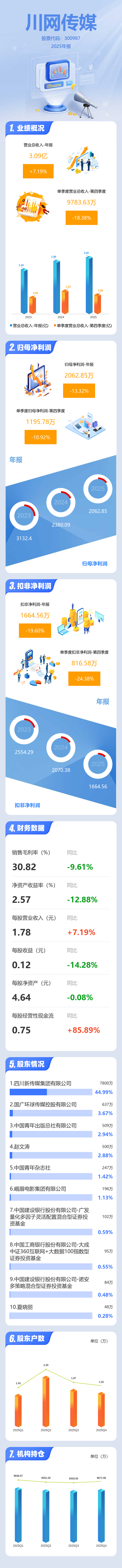 证券之星消息,川网传媒2025年年报显示,当年度公司主营收入3.09亿元,同比上升7.2%;归母净利润2062.85万元,同比下降13.33%;扣非净利润1664.56万元,同比下降19.6%;其中2025年第四季度,公司单季度主营收入9783.63万元,同比下降18.39%;单季度归母净利润1195.78万元,同比下降10.93%;单季度扣非净利润816.58万元,同比下降24.38%;负债率27.76%,投资收益14.68万元,财务费用-467.83万元,毛利率30.82%。