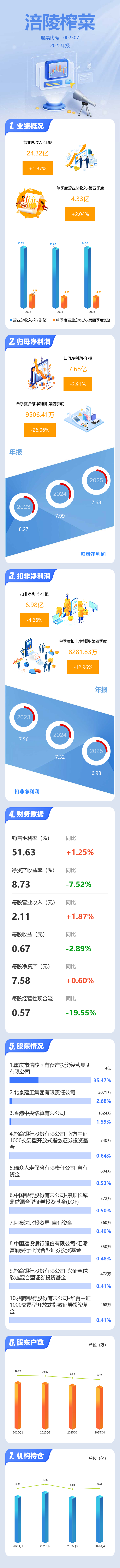 证券之星消息,涪陵榨菜2025年年报显示,当年度公司主营收入24.32亿元,同比上升1.88%;归母净利润7.68亿元,同比下降3.92%;扣非净利润6.98亿元,同比下降4.67%;其中2025年第四季度,公司单季度主营收入4.33亿元,同比上升2.04%;单季度归母净利润9506.41万元,同比下降26.06%;单季度扣非净利润8281.83万元,同比下降12.96%;负债率9.64%,投资收益7258.14万元,财务费用-8897.37万元,毛利率51.63%。