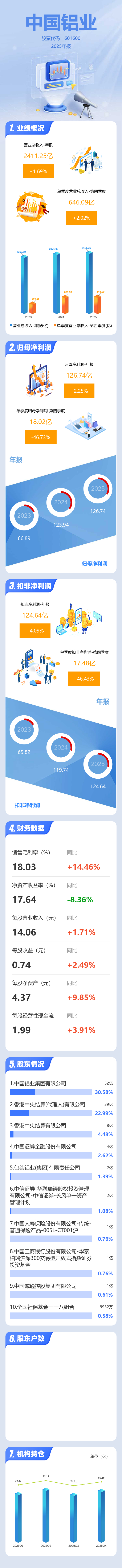 证券之星消息,中国铝业2025年年报显示,当年度公司主营收入2411.25亿元,同比上升1.69%;归母净利润126.74亿元,同比上升2.25%;扣非净利润124.64亿元,同比上升4.1%;其中2025年第四季度,公司单季度主营收入646.09亿元,同比上升2.02%;单季度归母净利润18.02亿元,同比下降46.74%;单季度扣非净利润17.48亿元,同比下降46.43%;负债率46.01%,投资收益6.93亿元,财务费用21.62亿元,毛利率18.03%。
