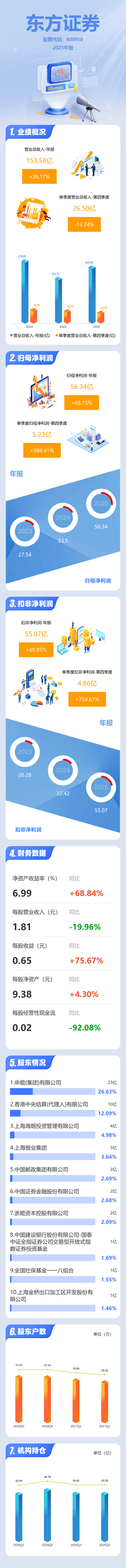 证券之星消息,东方证券2025年年报显示,当年度公司主营收入153.58亿元,同比上升26.18%;归母净利润56.34亿元,同比上升68.16%;扣非净利润55.07亿元,同比上升69.85%;其中2025年第四季度,公司单季度主营收入26.5亿元,同比下降13.25%;单季度归母净利润5.23亿元,同比上升986.41%;单季度扣非净利润4.86亿元,同比上升754.67%;负债率83.02%,投资收益78.63亿元。