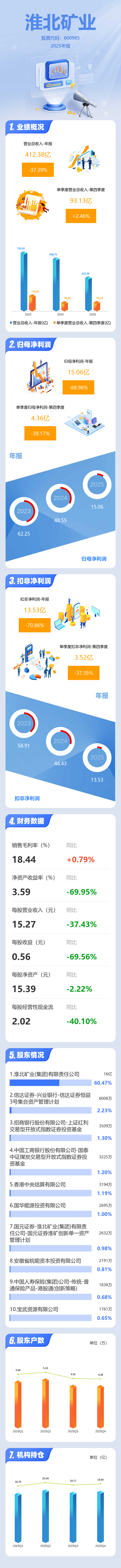 证券之星消息,淮北矿业2025年年报显示,当年度公司主营收入412.38亿元,同比下降37.4%;归母净利润15.06亿元,同比下降68.98%;扣非净利润13.53亿元,同比下降70.87%;其中2025年第四季度,公司单季度主营收入93.13亿元,同比上升2.46%;单季度归母净利润4.36亿元,同比下降39.17%;单季度扣非净利润3.52亿元,同比下降37.35%;负债率48.79%,投资收益1.55亿元,财务费用5.17亿元,毛利率18.44%。