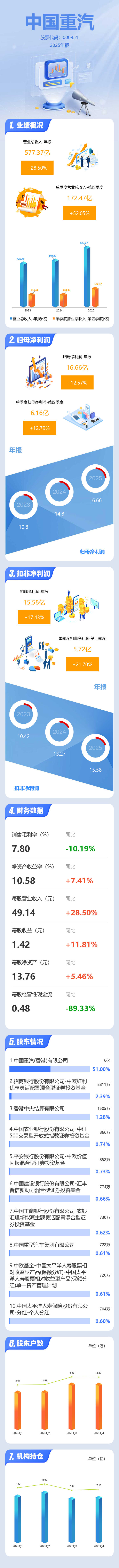 证券之星消息,中国重汽2025年年报显示,当年度公司主营收入577.37亿元,同比上升28.51%;归母净利润16.66亿元,同比上升12.58%;扣非净利润15.58亿元,同比上升17.43%;其中2025年第四季度,公司单季度主营收入172.47亿元,同比上升52.06%;单季度归母净利润6.16亿元,同比上升12.79%;单季度扣非净利润5.72亿元,同比上升21.7%;负债率65.35%,投资收益-2638.87万元,财务费用-2.68亿元,毛利率7.8%。