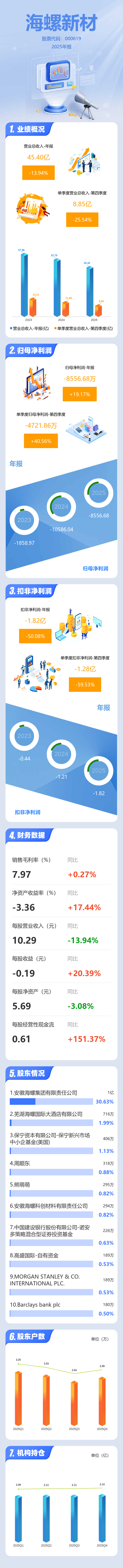 证券之星消息,海螺新材2025年年报显示,当年度公司主营收入45.4亿元,同比下降13.95%;归母净利润-8556.68万元,同比上升19.17%;扣非净利润-1.82亿元,同比下降50.08%;其中2025年第四季度,公司单季度主营收入8.85亿元,同比下降25.55%;单季度归母净利润-4721.86万元,同比上升40.57%;单季度扣非净利润-1.28亿元,同比下降59.53%;负债率43.89%,投资收益-519.75万元,财务费用1976.12万元,毛利率7.97%。