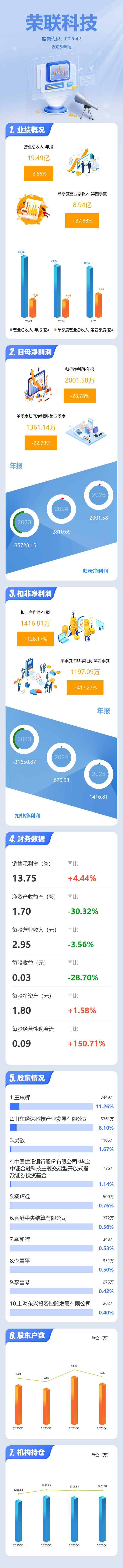 证券之星消息,荣联科技2025年年报显示,当年度公司主营收入19.49亿元,同比下降3.57%;归母净利润2001.58万元,同比下降28.79%;扣非净利润1416.81万元,同比上升128.18%;其中2025年第四季度,公司单季度主营收入8.94亿元,同比上升37.89%;单季度归母净利润1361.14万元,同比下降22.79%;单季度扣非净利润1197.09万元,同比上升417.27%;负债率53.6%,投资收益36.45万元,财务费用763.76万元,毛利率13.75%。
