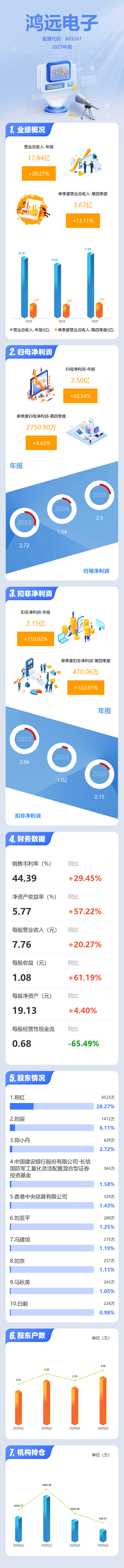 证券之星消息,鸿远电子2025年年报显示,当年度公司主营收入17.94亿元,同比上升20.28%;归母净利润2.5亿元,同比上升62.54%;扣非净利润2.15亿元,同比上升110.03%;其中2025年第四季度,公司单季度主营收入3.67亿元,同比上升13.11%;单季度归母净利润2750.9万元,同比上升4.43%;单季度扣非净利润470.06万元,同比上升122.62%;负债率17.5%,投资收益854.09万元,财务费用-332.64万元,毛利率44.39%。