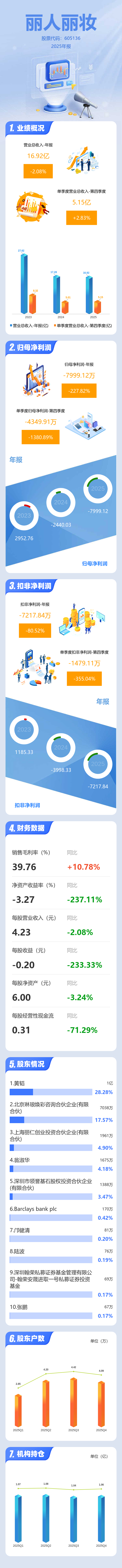 证券之星消息,丽人丽妆2025年年报显示,当年度公司主营收入16.92亿元,同比下降2.08%;归母净利润-7999.12万元,同比下降227.83%;扣非净利润-7217.84万元,同比下降80.52%;其中2025年第四季度,公司单季度主营收入5.15亿元,同比上升2.83%;单季度归母净利润-4349.91万元,同比下降1380.9%;单季度扣非净利润-1479.11万元,同比下降355.04%;负债率12.21%,投资收益769.97万元,财务费用-2097.7万元,毛利率39.76%。