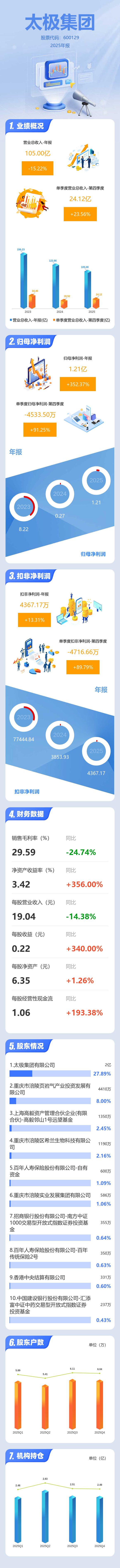 证券之星消息,太极集团2025年年报显示,当年度公司主营收入105.0亿元,同比下降15.23%;归母净利润1.21亿元,同比上升352.38%;扣非净利润4367.17万元,同比上升13.32%;其中2025年第四季度,公司单季度主营收入24.12亿元,同比上升23.57%;单季度归母净利润-4533.5万元,同比上升91.26%;单季度扣非净利润-4716.66万元,同比上升89.79%;负债率74.73%,投资收益-1176.31万元,财务费用1.48亿元,毛利率29.59%。