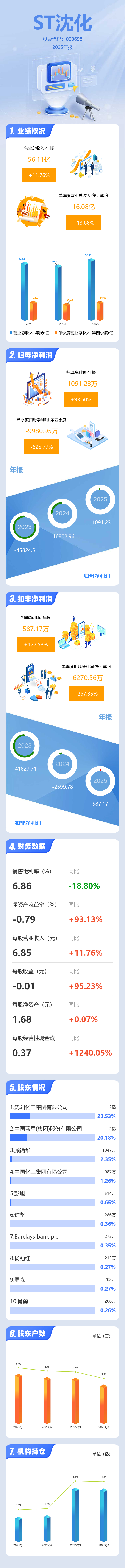 证券之星消息,ST沈化2025年年报显示,当年度公司主营收入56.11亿元,同比上升11.76%;归母净利润-1091.23万元,同比上升93.51%;扣非净利润587.17万元,同比上升122.59%;其中2025年第四季度,公司单季度主营收入16.08亿元,同比上升13.68%;单季度归母净利润-9980.95万元,同比下降625.78%;单季度扣非净利润-6270.56万元,同比下降267.35%;负债率73.07%,财务费用4265.37万元,毛利率6.86%。