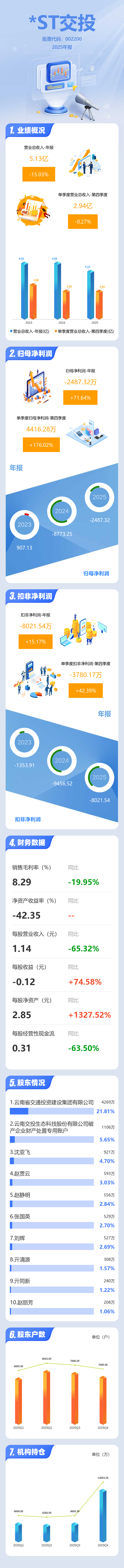 证券之星消息,*ST交投2025年年报显示,当年度公司主营收入5.13亿元,同比下降15.04%;归母净利润-2487.32万元,同比上升71.65%;扣非净利润-8021.54万元,同比上升15.17%;其中2025年第四季度,公司单季度主营收入2.94亿元,同比下降0.27%;单季度归母净利润4416.28万元,同比上升176.03%;单季度扣非净利润-3780.17万元,同比上升42.39%;负债率50.53%,投资收益5223.02万元,财务费用-638.33万元,毛利率8.29%。