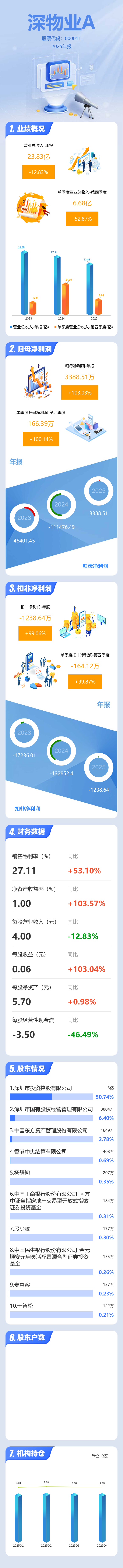 证券之星消息,深物业A2025年年报显示,当年度公司主营收入23.83亿元,同比下降12.83%;归母净利润3388.51万元,同比上升103.04%;扣非净利润-1238.64万元,同比上升99.07%;其中2025年第四季度,公司单季度主营收入6.68亿元,同比下降52.87%;单季度归母净利润166.39万元,同比上升100.15%;单季度扣非净利润-164.12万元,同比上升99.88%;负债率79.04%,投资收益93.07万元,财务费用1.14亿元,毛利率27.11%。