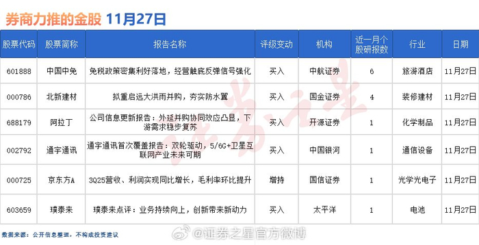 据证券之星数据库不完全统计,11月27日券商共给予近10家A股上市公司“买入”评级。从行业分布看,券商11月27日关注的个股聚焦于旅游酒店、装修建材、化学制品、通信设备、光学光电子、电池等行业。
