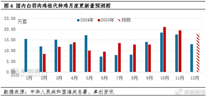 综上所述,2025年上半年受供种国更迭变化,且1-2月祖代种鸡暂未引种影响,业内多预期2025年祖代种鸡总更新量或在130万套左右,但自9月份法国方面调整供种方案,使得月度引种批次增加,单月引种量多在7.50万套以上,使得月度更新量最高达21.00万套,1-11月更新量超130.00万套。按照当前引种计划及国内自繁情况来看,12月更新量或持续高位,推动全年更新量超150.00万套,从种禽端来看,国内白羽肉鸡行业持续扩量仍有支撑。
