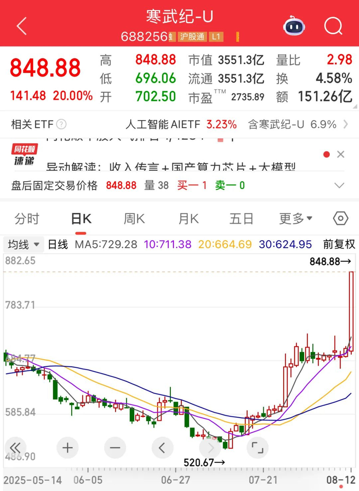 AI产业链持续活跃,算力、芯片概念股盘中大幅拉升,“龙头股”寒武纪20cm涨停,股价创历史新高;工业富联涨超9%,同样创出新高。
