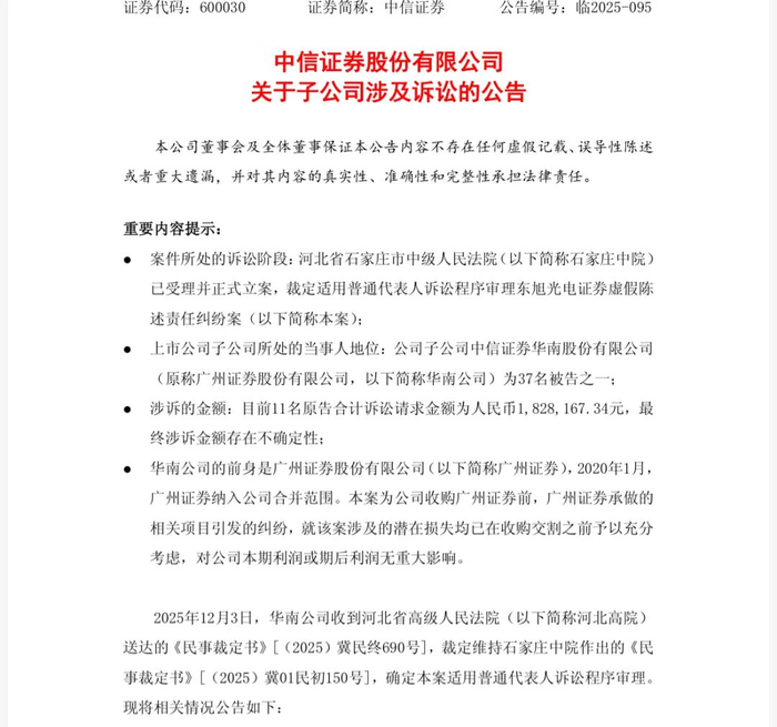 中信证券公告显示,华南公司于12月3日收到河北省高级人民法院送达的《民事裁定书》[(2025)冀民终690号],裁定维持石家庄中院作出的《民事裁定书》[(2025)冀01民初150号],确定本案适用普通代表人诉讼程序审理。