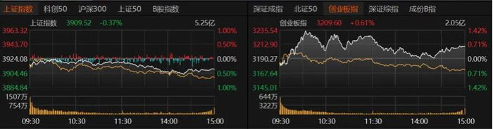指数表现分化,沪指收跌0.37%报3909.52点,创业板指收涨0.61%报3209.6点,深证成指、科创50、沪深300、上证50均微跌,北证50跌近2%。