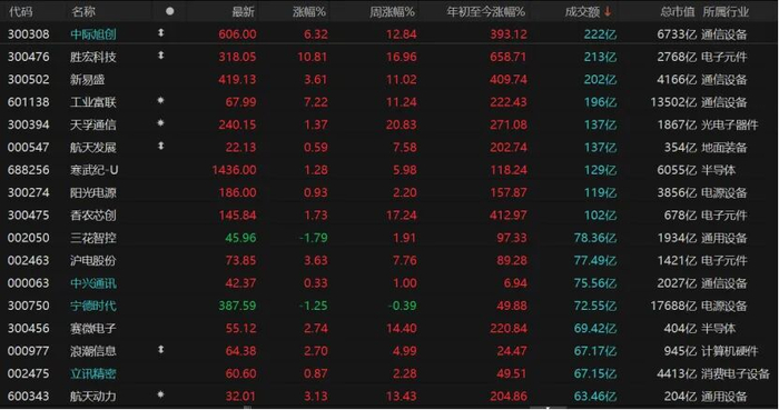 市场共计1308只个股收涨,涨停股54只;4058只个股收跌,跌停股12只。9只个股日成交额超过100亿元,CPO概念龙头股“易中天”再度成为市场最靓的仔,中际旭创收涨6.32%报606元/股,新易盛收涨3.61%报419.13元/股,天孚通信收涨1.37%报240.15元/股。电子元件个股胜宏科技收涨10.81%报318.05元/股,通信设备个股工业富联收涨7.22%报67.99元/股。