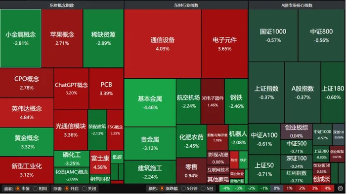 盘面上,科技股仍是资金偏爱方向。CPO概念继续走高,通信设备、电子元件、光电子器件、新型工业化、英伟达概念大涨。但基本金属、黄金概念、航空机场、贵金属、化肥农药、建筑施工、钢铁、机器人等概念跌幅明显。