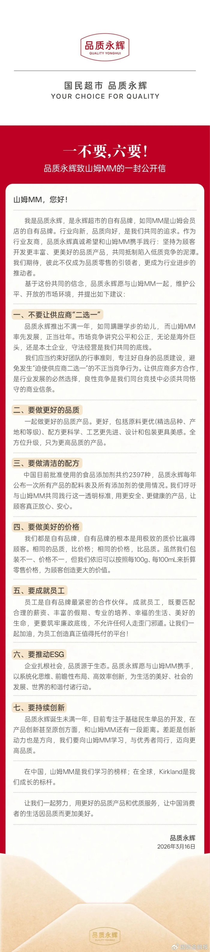 3月16日,永辉超市(601933)自有品牌“品质永辉”发布致山姆MM的一封公开信,信中重点呼吁山姆MM不要让供应商“二选一”,应当约束好团队的行事准则,专注好自身的品质建设。