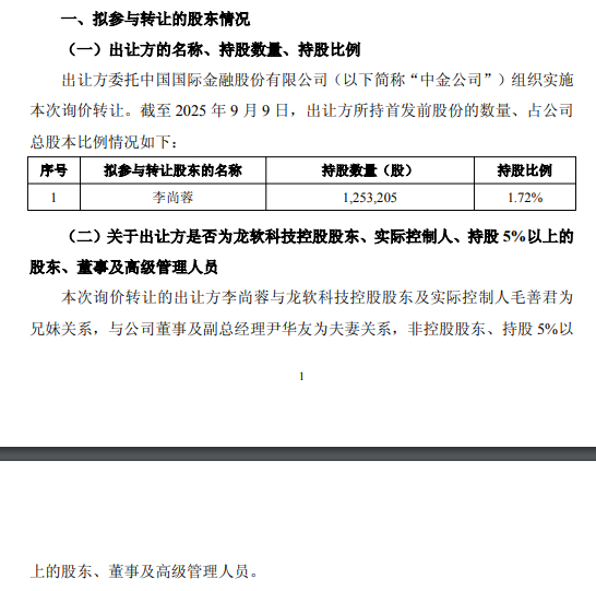 公告显示,本次询价转让的出让方李尚蓉与龙软科技控股股东及实际控制人毛善君为兄妹关系,与公司董事及副总经理尹华友为夫妻关系,非控股股东、持股5%以上的股东、董事及高级管理人员。