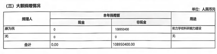 记者查询哈尔滨工业大学教育发展基金会2024年度工作报告发现,2024年度基金会收到捐赠人康为民的非现金捐赠,合计金额为108950400元,捐赠用途为“助力学校科研能力建设”。