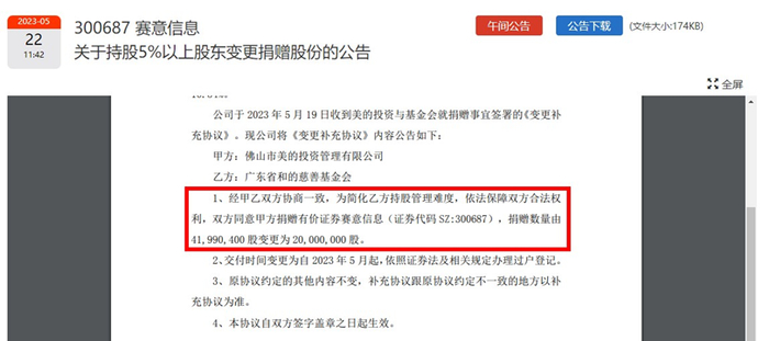 2020年6月21日,广州赛意信息科技股份有限公司发布公告称,广州赛意信息科技股份有限公司持股5%以上股东——佛山市美的投资管理有限公司与广东省和的慈善基金会签署《捐赠协议》,为推动公益慈善发展,美的投资拟向基金会无偿捐赠公司股票41990400股,占公司总股本的10.54%。按照当时的市值计算,这部分股权市值约为9.95亿元。