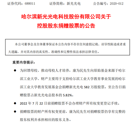 2020年6月2日,新光光电发布关于控股股东捐赠股票的公告。公告称,公司于2020年6月1日接到控股股东康为民通知,其与哈尔滨工业大学教育发展基金会签署了《捐赠协议书》。根据公告,为回馈母校、推动母校人才培养,康为民向哈尔滨工业大学教育发展基金会捐赠新光光电582万股股票。至公告日,捐赠股票占新光光电总股本的5.82%。按照当时股价计算,这批股票价值高达2.4亿元。