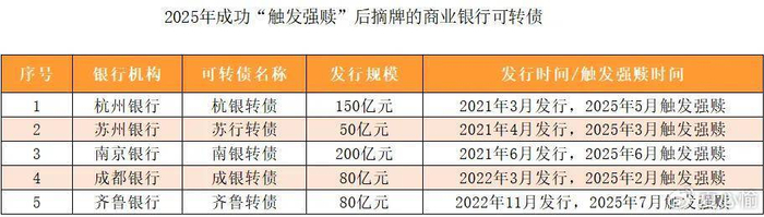 从2025年的市场来看,已有多只银行转债陆续退出市场。其中,齐鲁转债、南银转债、杭银转债、苏行转债、成银转债等因正股股价走强触发强赎条款而摘牌;中信转债、浦发转债则因到期而退出。