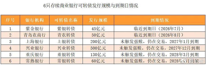 这其中,由紫金银行(601860.SH)、青岛农商行(002958.SZ)发行的紫银转债、青农转债,将分别于今年7、8月到期。公开资料显示,紫金银行于2020年7月23日发行了45亿元的可转债,期限6年,到期日为2026年7月23日。
