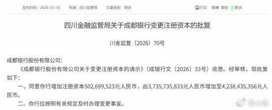 以成都银行(601838.SH)为例,其于2022年发行的成银转债,在2025年2月因强赎摘牌,今年3月经监管核准过后,注册资本由37.36亿元增至42.38亿元,增幅达13.46%,成为2026年首家通过可转债转股实现资本扩充的银行。