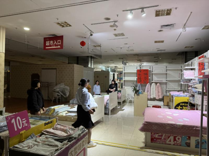 2024年,江门人人乐百货商场歇业,商场内许多商家打出“亏本清货”“一件不留”等标语。