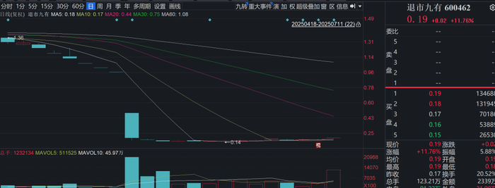 7月14日,退市九有延续涨停,报收0.21元每股,这是公司连续第二个交易日后涨停。14日为其终止上市前的最后一个交易日。