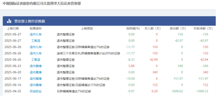 中银国际太原迎泽大街席位先后参与了退市鹏博、退市九有和*ST广道的交易;海通证券武汉中北路席位参与过退市锦港、退市九有、退市龙宇等多只将退市股票的交易;海通证券青岛福州南路席位参与过退市锦港、退市鹏博的交易;平安证券芜湖黄山中路席位参与过*ST广道、退市九有、退市鹏博、普利退的交易。