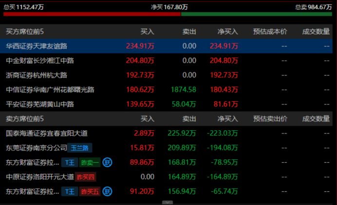 当天“顶风买入”的席位有华西证券天津友谊路、中金财富证券长沙湘江中路、浙商证券杭州杭大路、中信证券华南分公司广州花都曙光路、平安证券芜湖黄山中路等五个席位,买入金额分别达到234.91万元、204.80万元、192.73万元、180.62万元、139.65万元,合计买入金额952.71万元,净买入894.48万元。