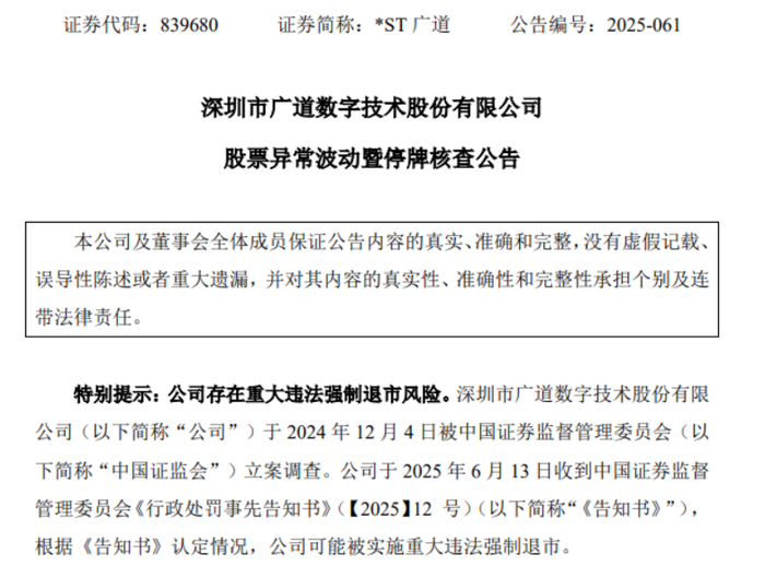 因造假行为触及《北京证券交易所股票上市规则》10.5.1条重大违法情形,*ST广道可能被强制退市。根据公告,公司股票于6月16日停牌1个交易日,6月17日复牌后继续实施退市风险警示,证券简称仍为“*ST广道”。若后续正式处罚决定认定触及退市标准,股票将被终止上市。