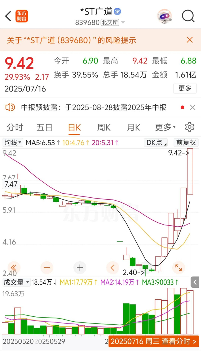 退市悬崖上的“末日狂欢”仍未停歇。7月16日,已触及重大违法情形可能被强制退市的*ST广道(839680)再封涨停,6个交易日5次触及涨停,累计涨幅高达251.49%,三次停牌核查都未能按住躁动的资金。