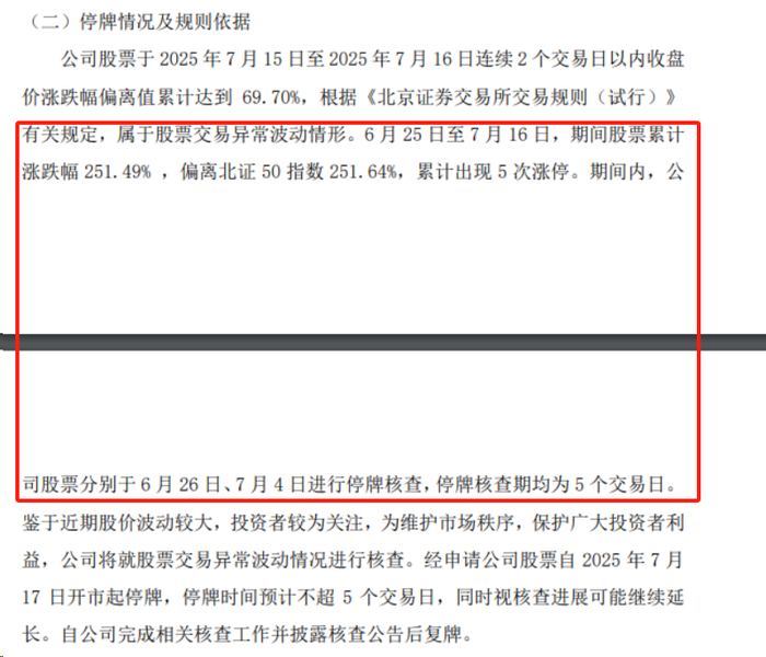 诡异的是,退市警报拉响后,*ST广道股价却开启“暴涨”模式:6月25日至7月16日的6个交易日内,每日换手率均超过30%,连续5次触发“30cm”涨停,累计涨幅达251.49%。其间公司三度申请停牌核查,但每次复牌后游资仍“顶板”拉升。7月16日晚,*ST广道公告,再次因股价异常波动停牌核查。