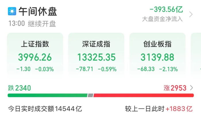 11月10日上午,A股整体弱市整理,创业板指表现较弱。截至午间收盘,上证指数微跌0.03%,报3996.26点;深证成指、创业板指分别跌0.59%、2.13%。沪深北三市半日成交14544亿元,较上个交易日同期放量1883亿元。
