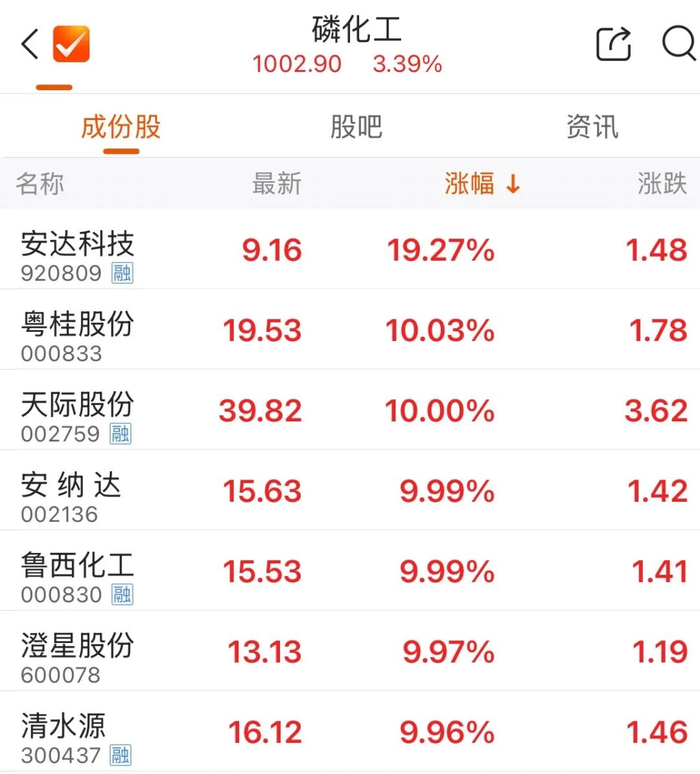 早盘,化工板块延续强势,磷概念、有机硅、氟概念均表现亮眼。截至午间收盘,澄星股份走出3连板,清水源盘中涨超16%,天际股份、深圳新星、鲁西化工等多只个股涨停。