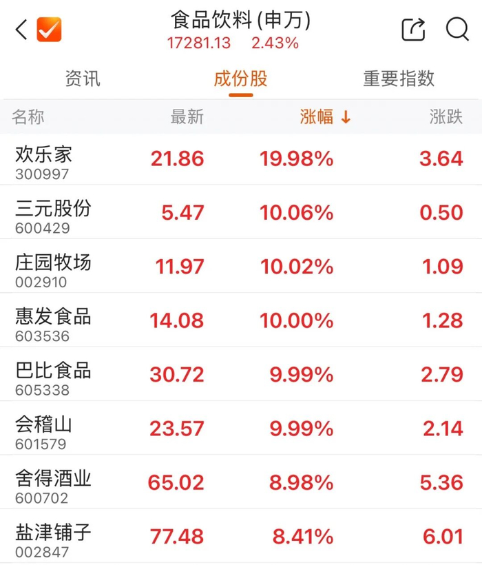 早盘,食品饮料、旅游酒店、免税等多个方向表现活跃。截至收盘,欢乐家以20%幅度涨停,锦江酒店、会稽山、东百集团等涨停。