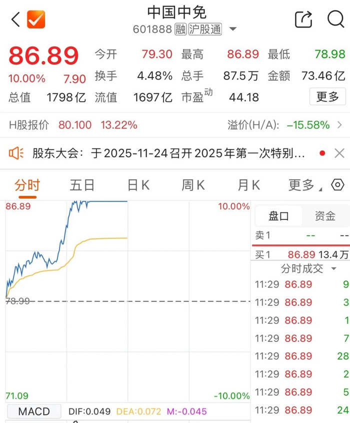 免税龙头中国中免A股强势涨停,午盘收报86.89元/股,成交额73.46亿元,总市值接近1800亿元;中国中免H股同步走强,盘中一度涨超13%。