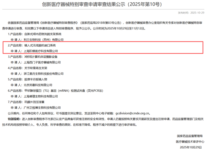 消息面上,近日,由上海阶梯医疗科技有限公司(简称“阶梯医疗”)自主研发的“植入式无线脑机接口系统”正式进入国家药品监督管理局医疗器械技术审评中心的创新医疗器械特别审查程序(2025年第10号),该审查结果公示期为10月29日至11月12日。