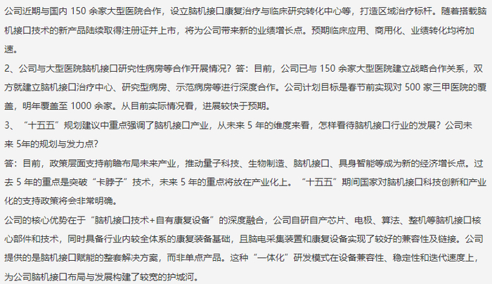 多家公司近期也在互动易回复了脑机接口业务相关进展。比如,爱朋医疗披露,在脑机接口领域,公司持续推进围术期脑状态监测、多动症、睡眠疾病诊治、癫痫等精神类疾病诊疗的临床创新应用。