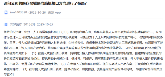 美好医疗披露,目前,侵入式脑机接口产品在植入材料选择、生物相容性、自供电技术等关键领域与人工耳蜗高度相通。公司在侵入式、半侵入式、非侵入式脑机接口领域均进行了布局。