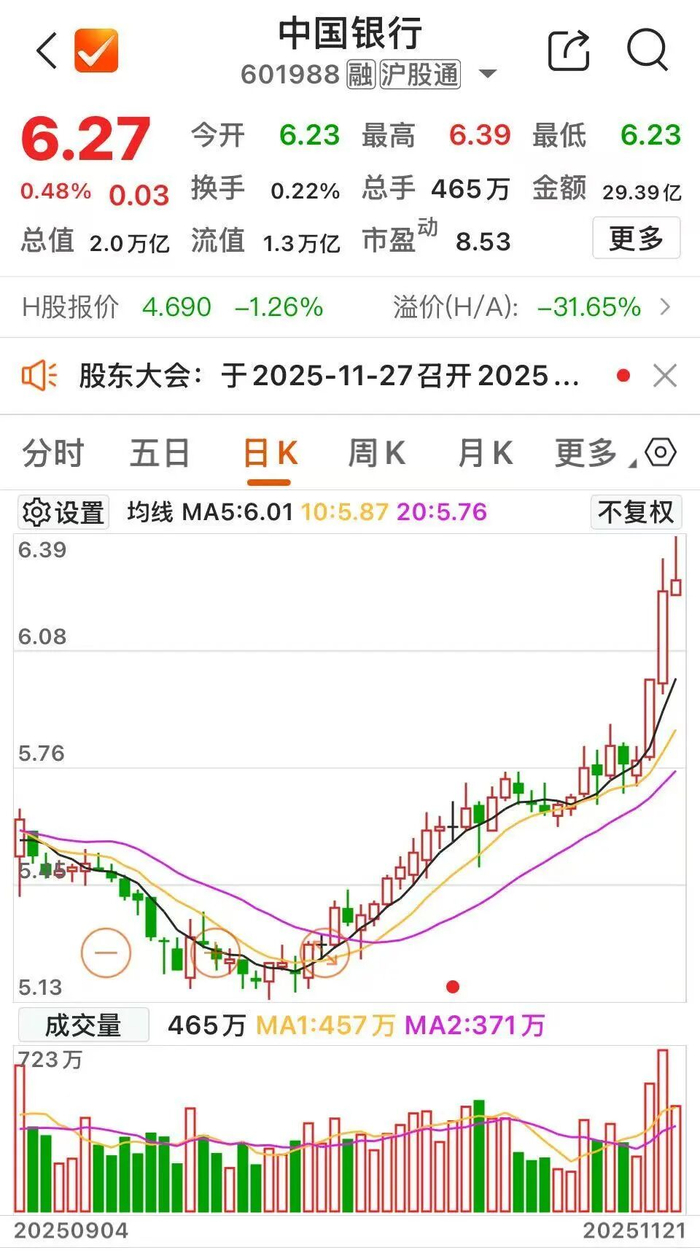 银行板块继续充当护盘角色,中国银行盘中涨超2%,本周累计涨约8%,市值站稳2万亿元。