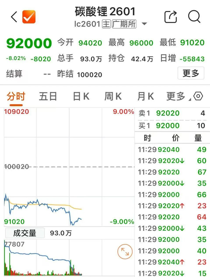备受关注的碳酸锂期货大幅回调,主力合约LC2601早盘触及9%幅度跌停,截至午间收盘下跌8.02%,报92000元/吨。